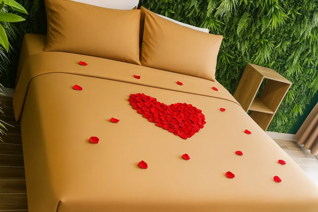 Coeur en pétales de roses sur le lit.
